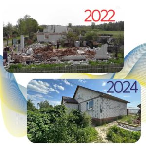 На фото зруйнований будинок місцевих жителів в селі Киїнка в 2022 році та його відбудова у 2024 році.