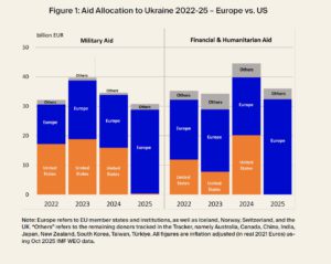 ЄС майже повністю взяв на себе підтримку України. У 2025 році допомога від США впала на 99% (був лише один пакет на €400 млн у січні). Натомість європейські донори збільшили військову підтримку на 67%, а фінансову та гуманітарну — на 59% (порівняно з середнім за 2022–2024 роки). Завдяки європейцям загальний обсяг допомоги залишився у стабільним.